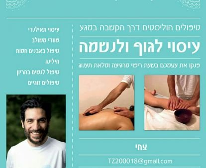 שמי צחי יששכר, ואני מזמין אתכם לעולם של רוגע, חיבור פנימי וריפוי הוליסטי. אני עוסק בעיסוי וטיפולים הוליסטיים מתוך אמונה שהגוף והנפש קשורים זה בזה, וכל טיפול הוא הזדמנות לאזן, להרגיע ולחדש את האנרגיה הפנימית שלכם.